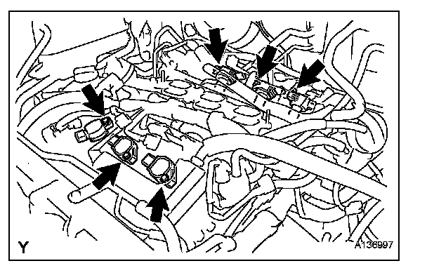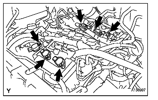 4. Disconnect the 6 ignition coil connectors and remove the 6 bolts and 6 ignition coils.