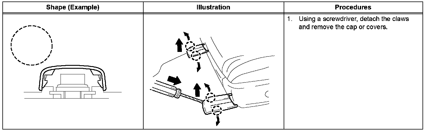 1. The removal and installation methods of typical claws used for vehicle body parts are shown in the table.