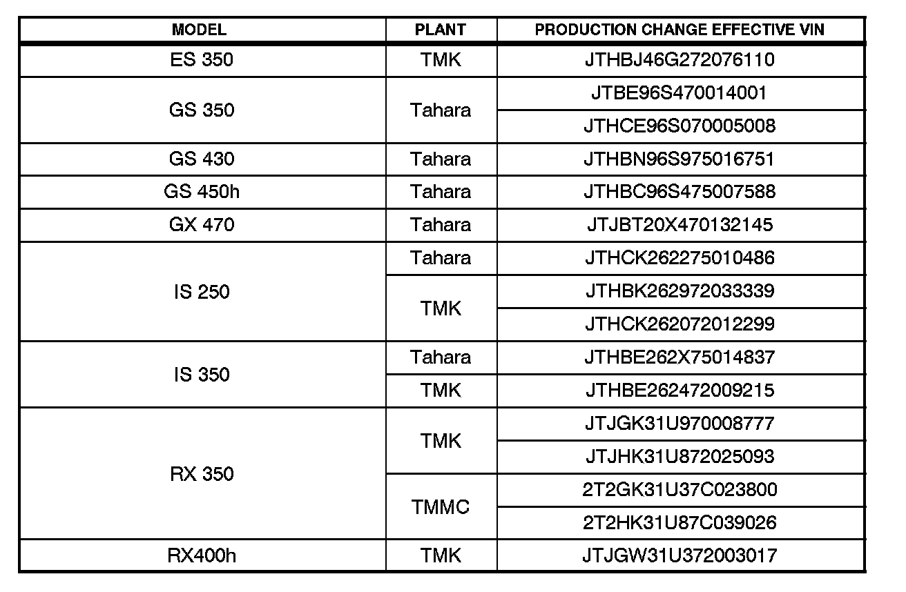 ^ 2007 model year ES 350, GS 350/430/450h, GX 470, IS 250/350, and RX 350/400h vehicles equipped with the Lexus Navigation System and produced BEFORE the Production Change Effective VINs shown in this TSIB.