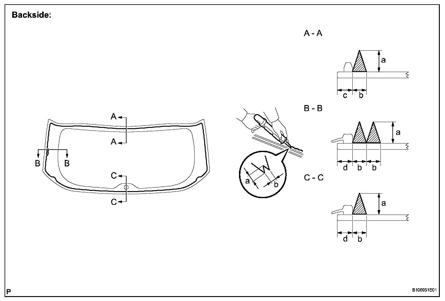 1. Hold the back window glass in place securely with tape or equivalent to the vehicle body until the adhesive has hardened.