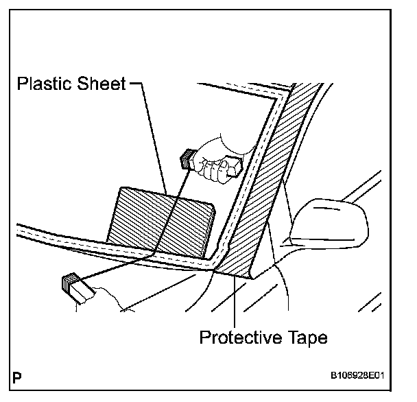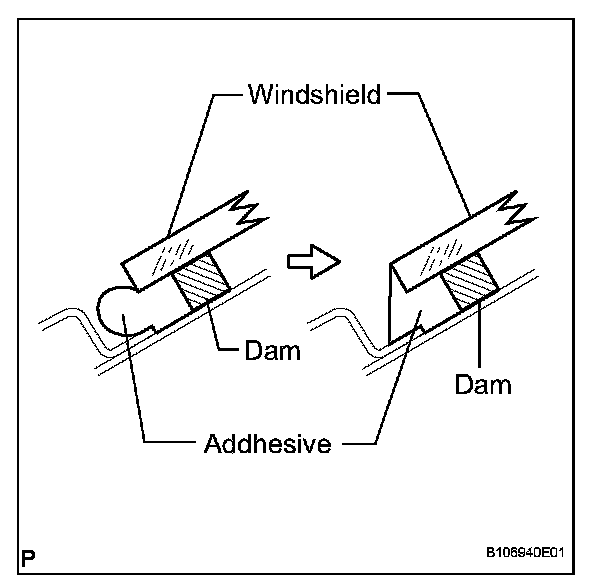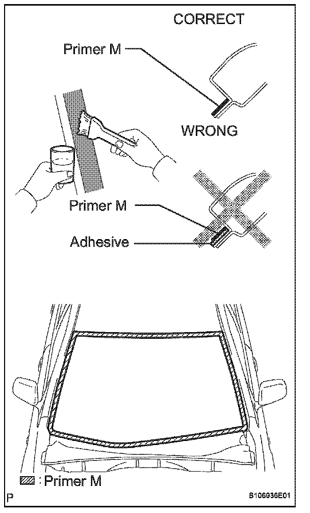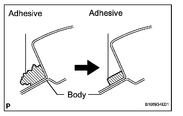 e. Apply adhesive (Adhesive: TOYOTA genuine windshield glass adhesive or equivalent).