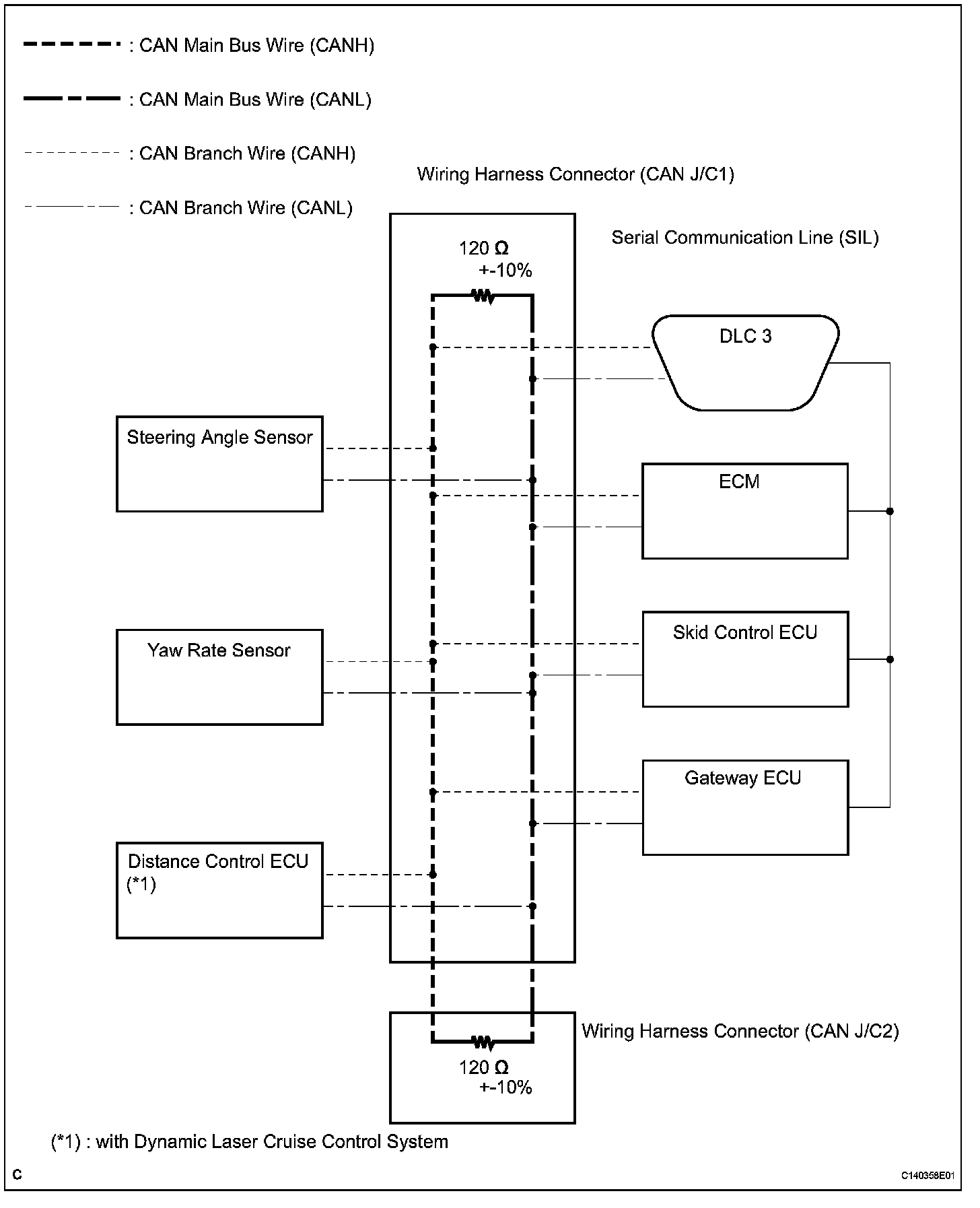 1. Two resistors of 120 ohms resistance are installed in parallel across the ends of the CAN main bus wires. They are called terminating resistors. These resistors allow the changes of the voltage differential between the CAN bus wires to be accurately judged. To allow proper function of CAN communication, it is necessary to have both terminating resistors installed. Since the two resistors are installed in parallel, a measurement of resistance between the two CAN bus wires should produce a reading of approximately 60 ohms.