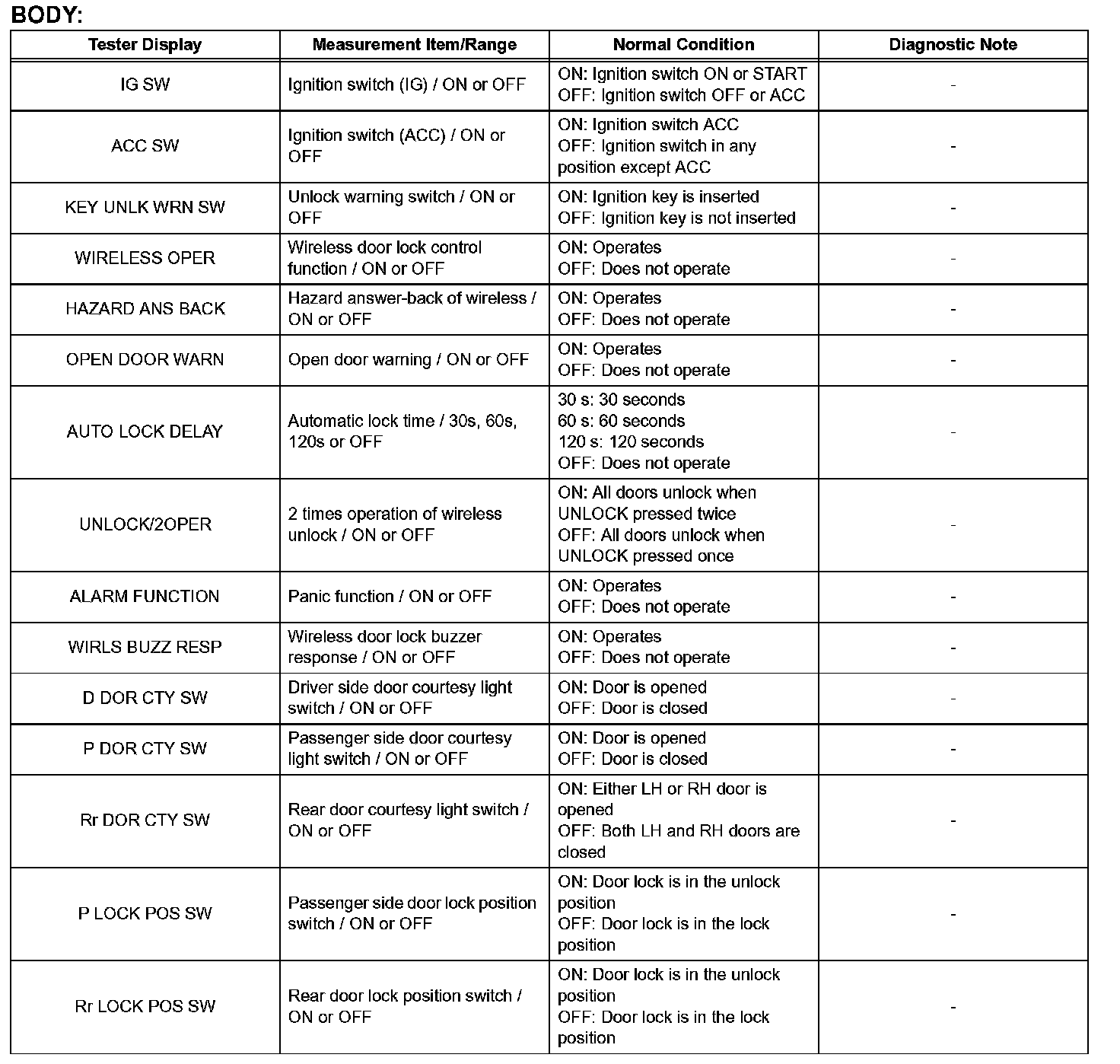 The wireless door lock control data list can be displayed while the intelligent tester is connected to the DLC3 with the ignition switch in the ON position. Follow the prompts on the tester screen to access the DATA LIST.
