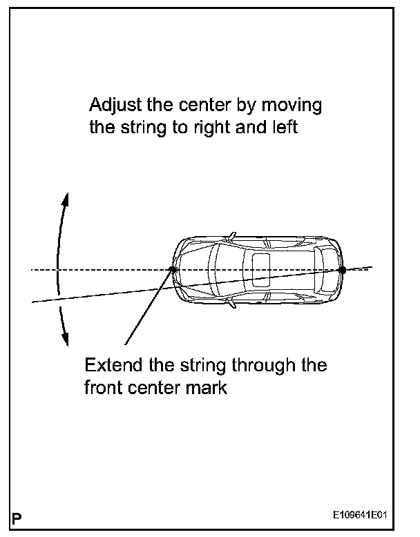 3. From the center (center of the emblem) of the front and rear bumpers, hang down the string with the plumb bob and mark the center points (both front and rear) of the vehicle on the ground surface.