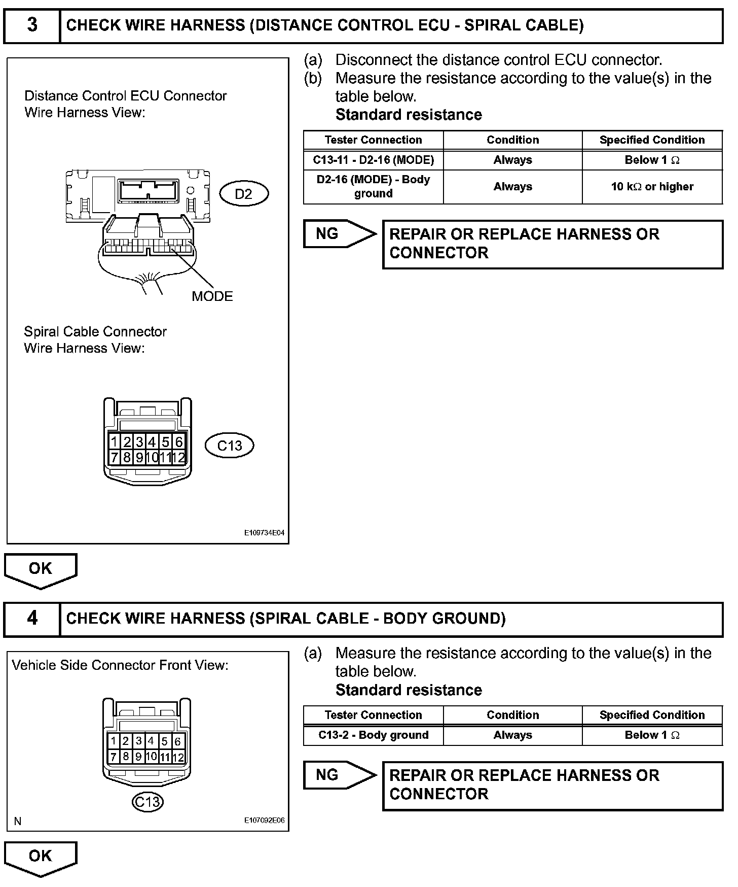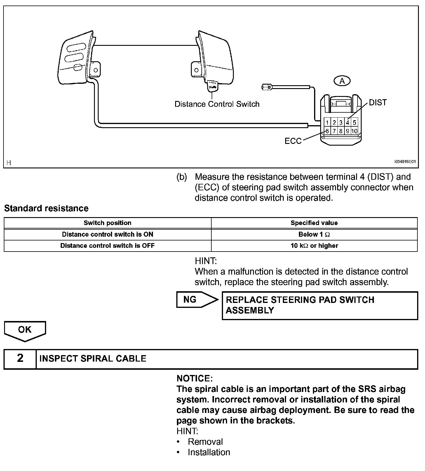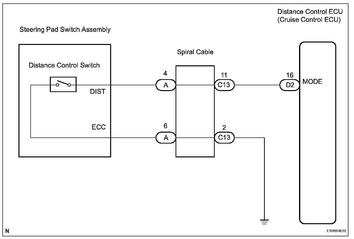 The distance control switch sets the vehicle-to-vehicle distance mode. The distance control switch is installed in the steering pad switch. The vehicle-to-vehicle distance set value can be changed by operating the steering pad switch (distance control switch) while the dynamic laser cruise control system is in operation. The steering pad switch uses the BEAN to communicate with each ECU. Therefore, it does not have a direct connection with the hybrid vehicle control ECU. If there are any malfunction in the communications line of the steering pad switch, one or more DTCs in the multiplex communication system are output.