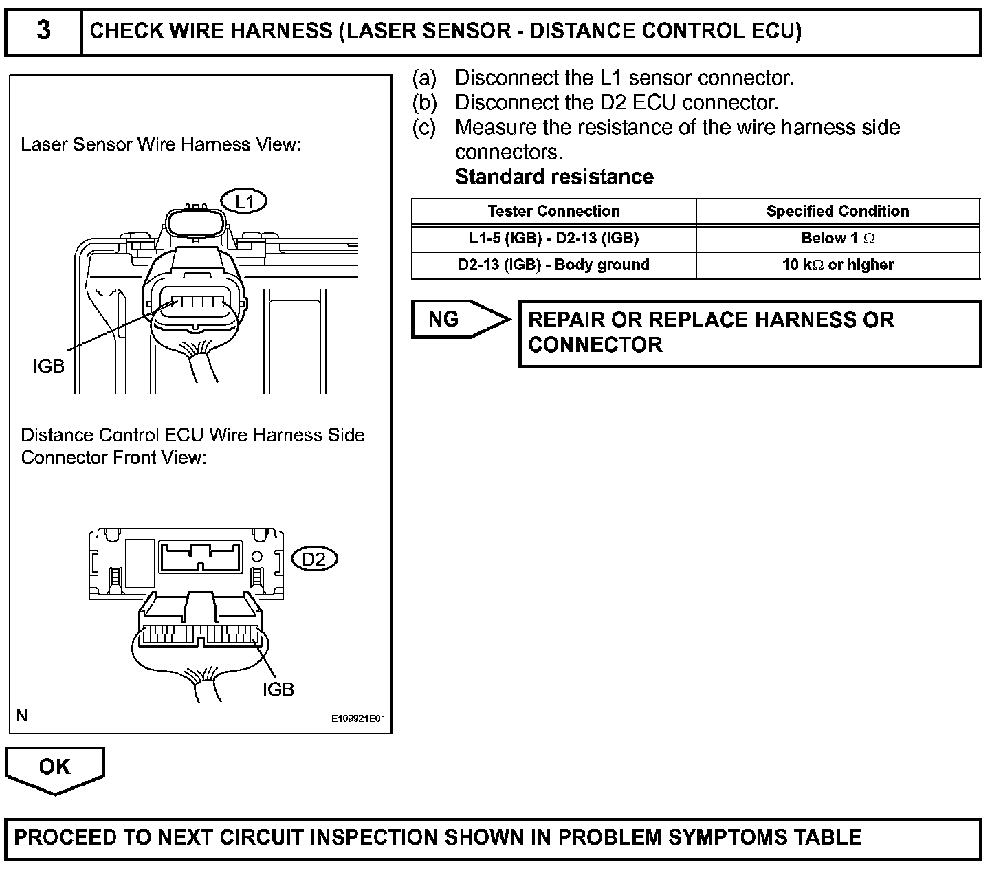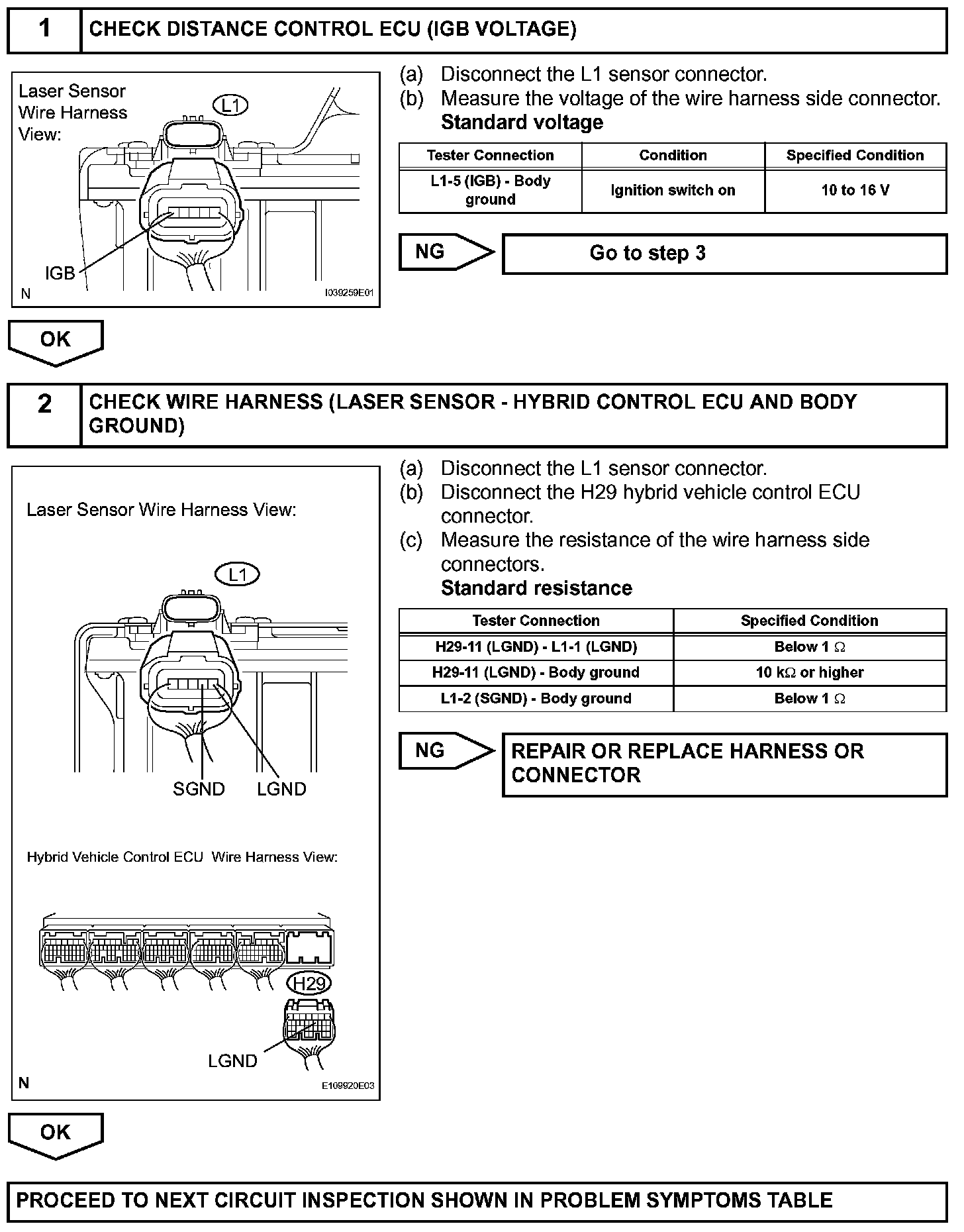 This circuit provides power to operate the laser sensor. The laser sensor emits laser beams towards an object in front and measures the distance and direction of the object by receiving the beam reflections. Based on the reflections, the sensor calculates the difference in speed between your own vehicle and the object in front. This data is transmitted to the distance control ECU (cruise control ECU).