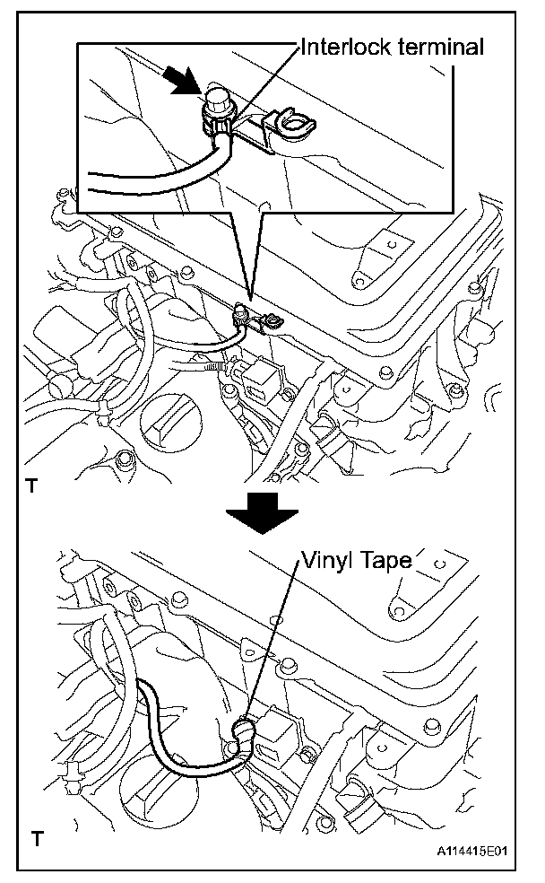 c. After removing the inverter cover, wrap the interlock round terminal for the inverter cover with vinyl tape to prevent it from shorting to ground.