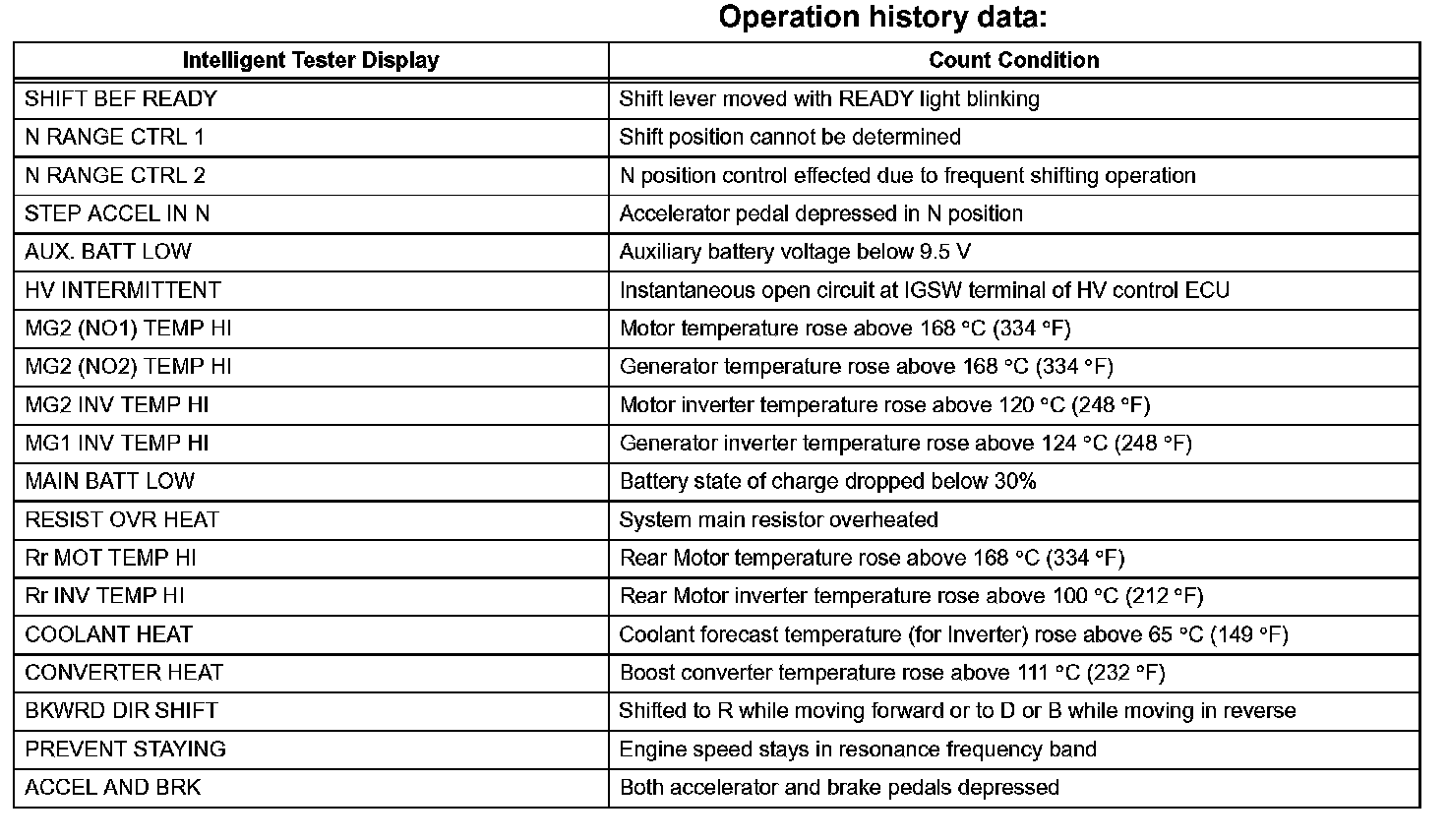 OPERATION HISTORY DATAHINT: The HV control ECU records the special operations performed by the driver and the number of abnormal conditions that have been input to the ECU as operation history data.