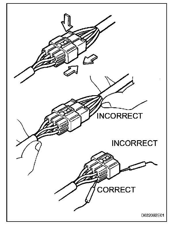 1. When disconnecting a connector, first squeeze the mating connector housing halves tightly together to release the lock, and then press the lock claw and separate the connector.