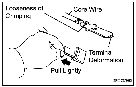 2. Checking when a connector is disconnected: Check by pulling the wire harness lightly from the backside of the connector. Look for unlatched terminals, missing terminals, loose crimps or broken conductor wires. Check visually for corrosion, metallic or foreign matter and water, and bent, rusted, overheated, contaminated, or deformed terminals.