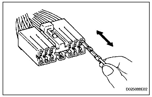 3. Checking the contact pressure of the terminal: Prepare a spare male terminal. Insert it into a female terminal, and check for ample tension when inserting and after full engagement.