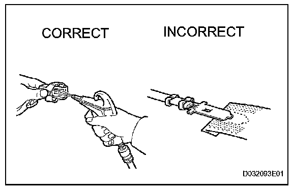 5. If checking a connector with a TOYOTA electrical tester, check the connector from the backside (harness side) using a mini test lead.