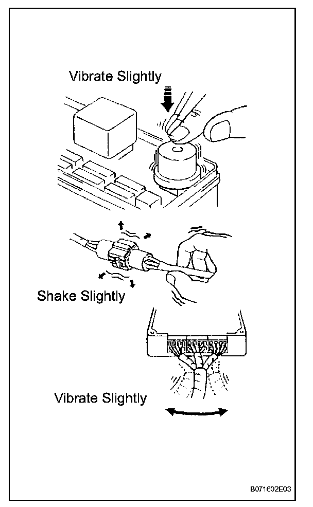 For example: With a problem that only occurs when the engine is cold or as a result of vibration caused by the road during driving, the problem can never be determined if the symptoms are being checked on a stationary vehicle or a vehicle with a warmed-up engine. Vibration, heat or water penetration (moisture) is difficult to reproduce. The symptom simulation tests below are effective substitutes for the conditions and can be applied on a stationary vehicle. Important points in the symptom simulation test: