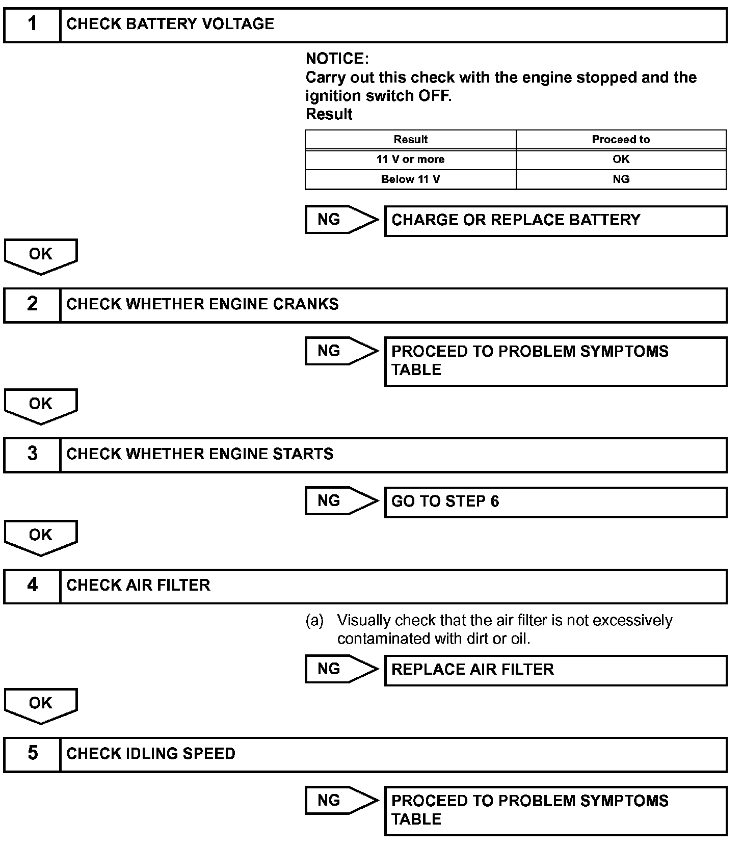 When the malfunction is not confirmed by the DTC check, troubleshooting should be carried out in all circuits considered to be possible causes of the problem. In many cases, by carrying out the basic engine check shown in the given flowchart, the location of the problem can be found quickly and efficiently. Therefore, using this check is essential when troubleshooting the engine.