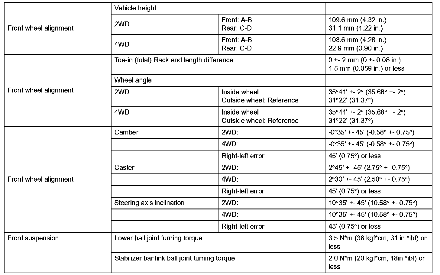 Front Suspension Service Data: