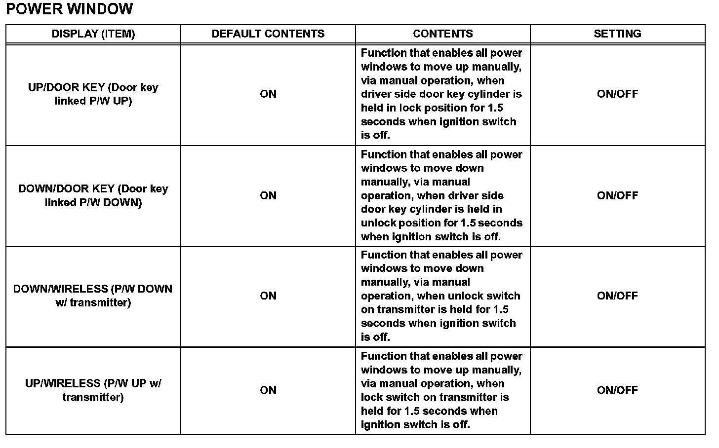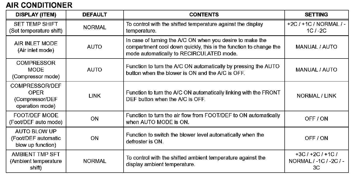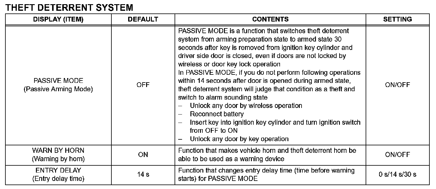 The buzzer ON/OFF setting, which is a setting of the buzzer function of the combination meter, can disable the driver side seat belt buzzer and front passenger side seat belt buzzer.