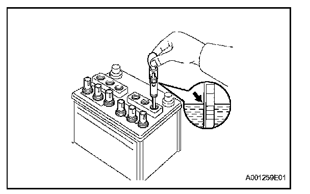 If the electrolyte quantity is below the lower line, check the battery voltage when cranking the engine. If the voltage is less than 9.6 V, recharge or replace the battery.