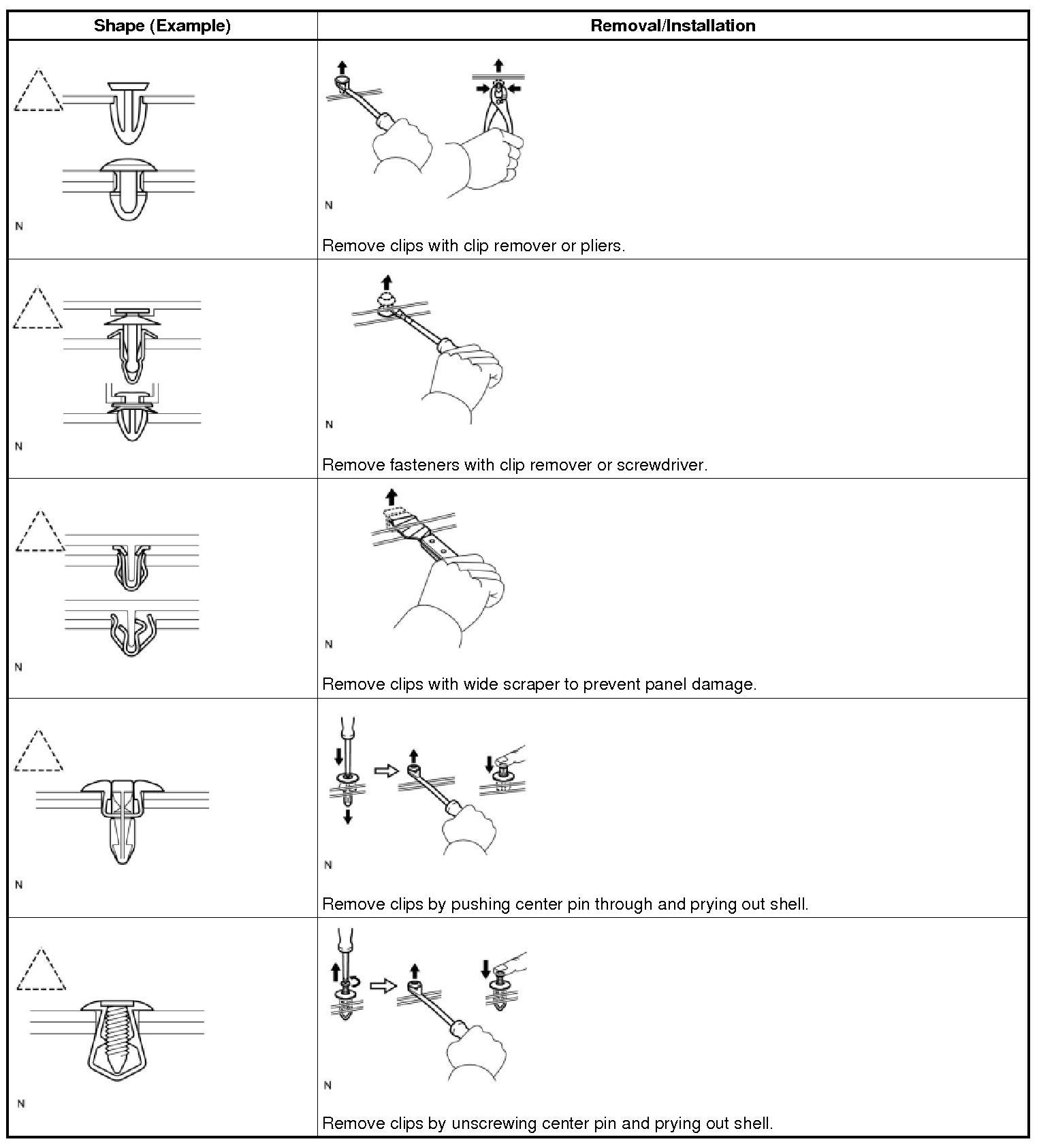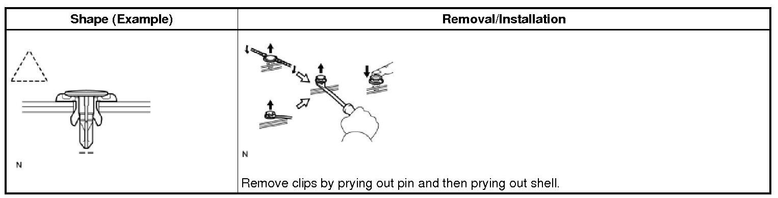 (1) The removal and installation methods of typical clips used for vehicle body parts are shown in the table below.