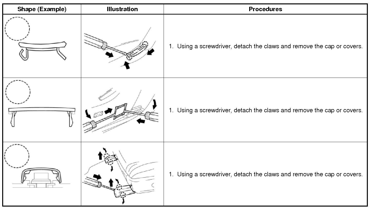 (1) The removal and installation methods of typical claws used for vehicle body parts are shown in the table below.