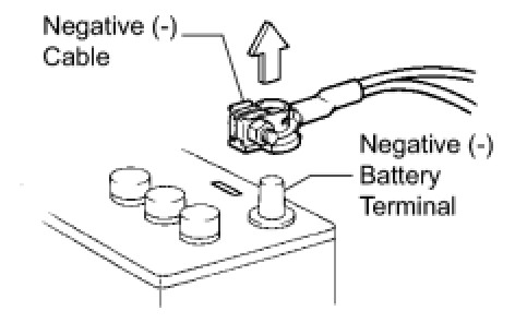 When the cable is disconnected from the negative (-) battery terminal, clock and audio system memory is erased. Before starting work, make a note of the settings of each memory system. When work is finished, reset the clock and audio system as before.