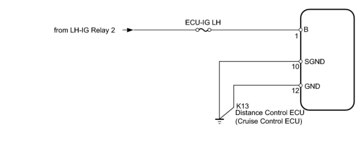 This circuit provides power to operate the distance control ECU (cruise control ECU). The distance control ECU (cruise control ECU) determines information about the vehicle in front based on data from the radar sensor, and then decides how much acceleration and / or deceleration is needed to maintain the set distance. The distance control ECU (cruise control ECU) also requests the skid control ECU to apply braking and sound the buzzer.