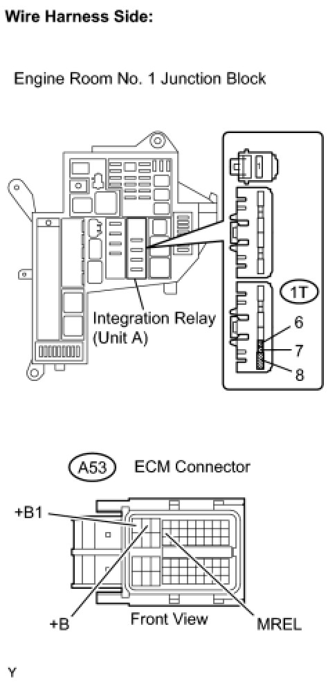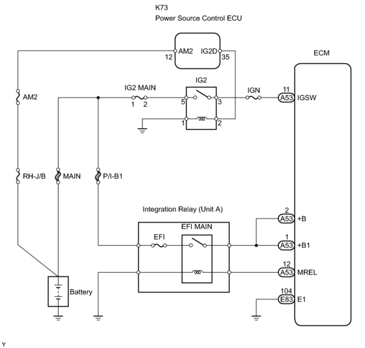 When the power switch is turned on (IG), the battery voltage is applied to the IGSW of the ECM. The output signal from the MREL terminal of the ECM causes a current to flow to the coil, closing the contacts of the integration relay (EFI MAIN relay) and supplying power to either terminal +B or +B1 of the ECM.