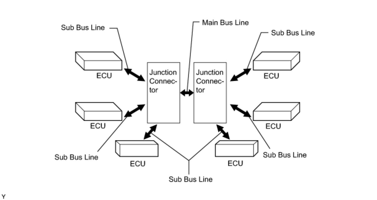 (2) CAN communication uses the bus style network to connect ECUs. This network consists of a main bus line (comprising junction connectors and a sub bus line (comprising ECUs that are connected to the main bus line). This style enables communication among all the connected ECUs.