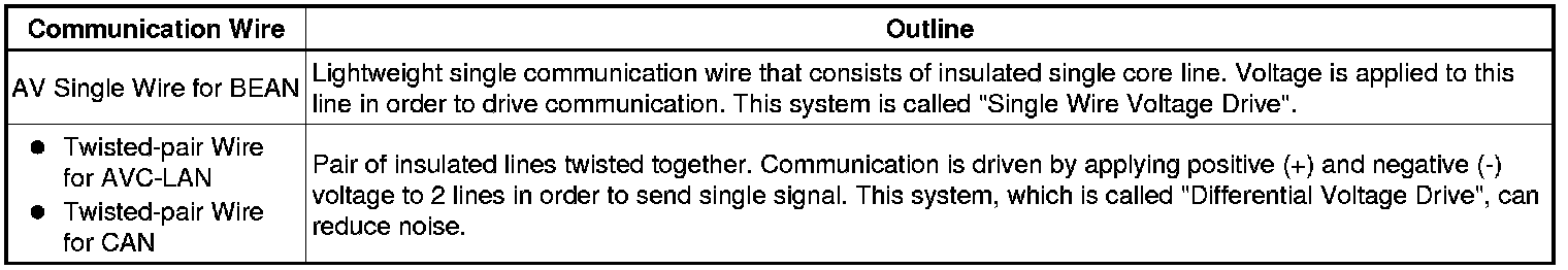 (2) A single, Automobile Vinyl (AV) wire is used for BEAN communication. A twisted-pair wire is used for CAN and AVC-LAN communication.