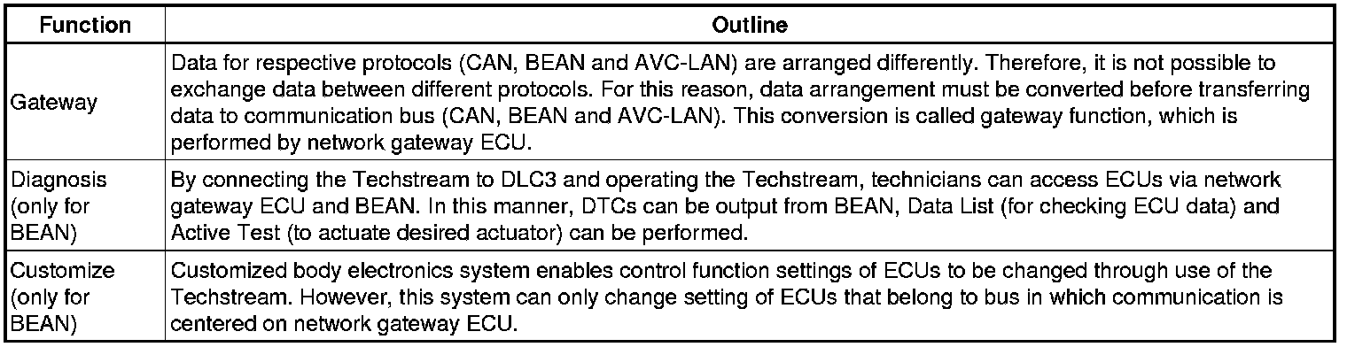 (1) The CAN, BEAN and AVC-LAN protocols have set guidelines for data. The guidelines include communication speed, type of communication wire, drive type and data length. These guidelines are established to facilitate ECU data communication.