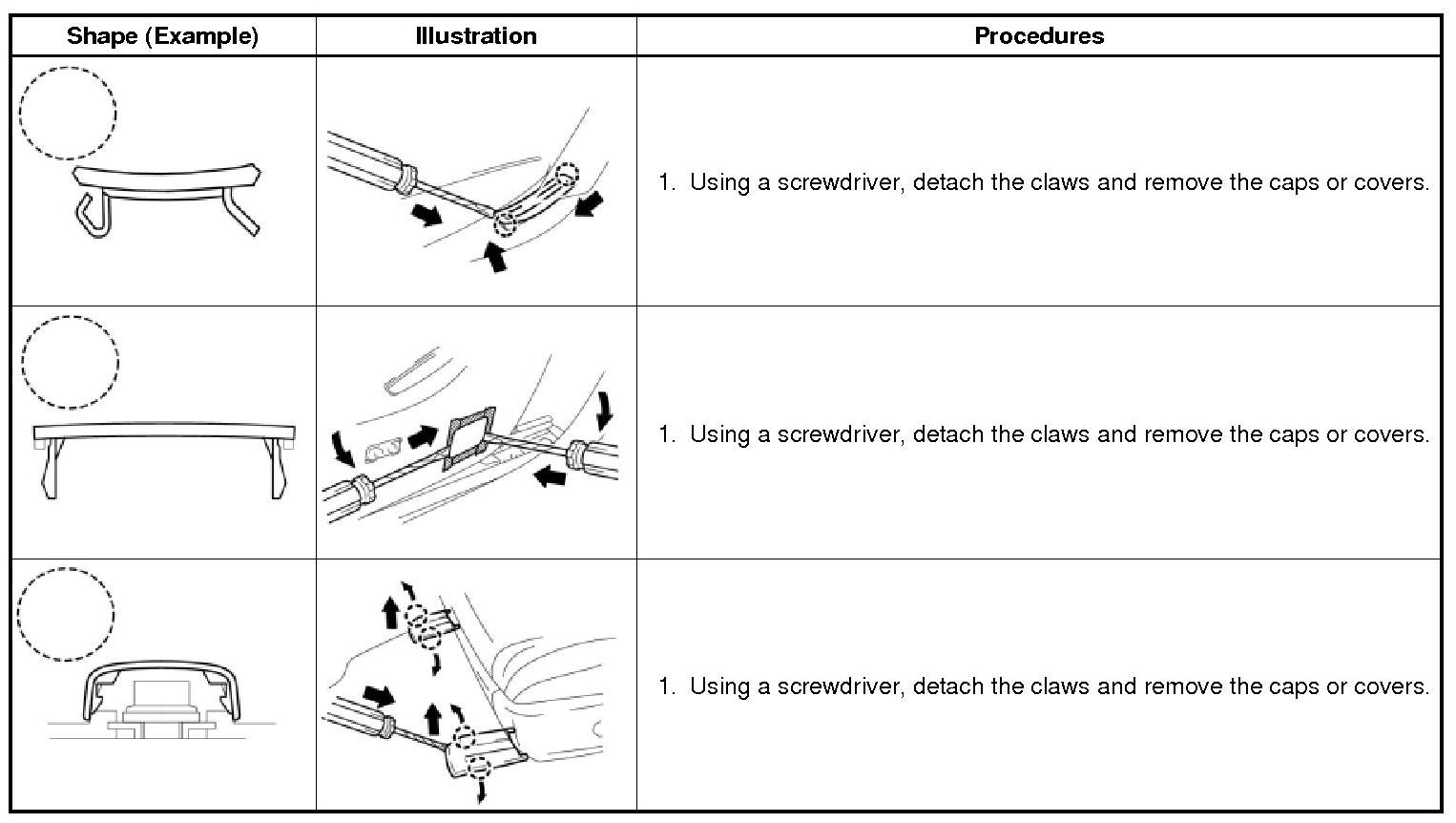 (1) The removal and installation methods of typical claws used for vehicle body parts are shown in the table below.