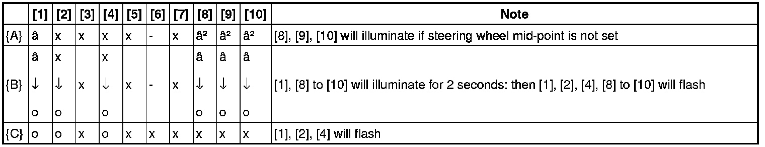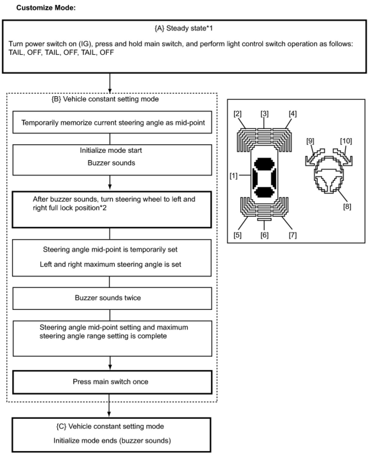 - *2: If 180 seconds pass, steering angle mid-point setting and maximum steering angle range setting will not occur and initialize mode will end.