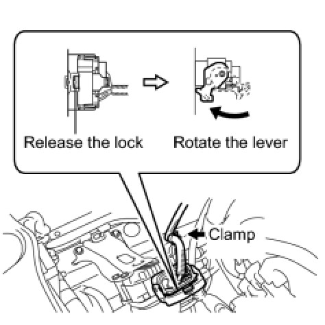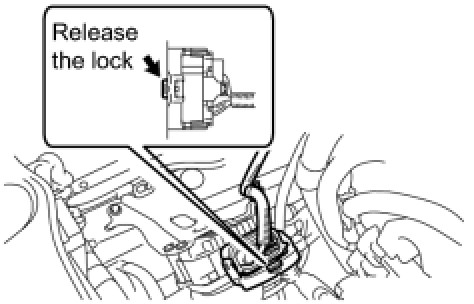 (h) Release the lock lever of the connector as shown in the illustration. Disconnect the connector from the oil pump motor controller.