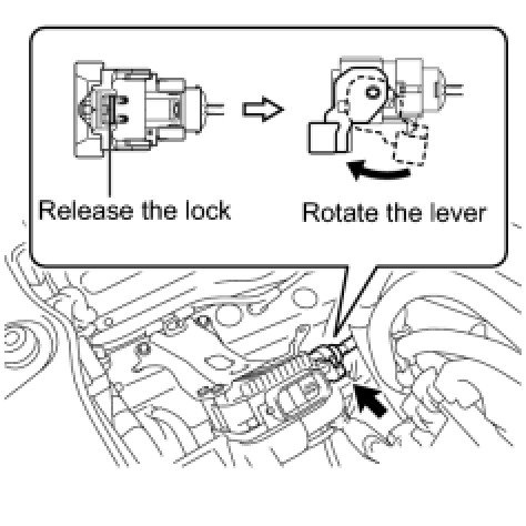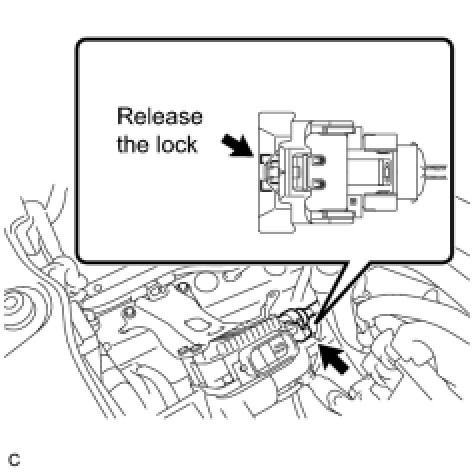 (b) Release the lock lever of the connector as shown in the illustration. Disconnect the connector from the oil pump motor controller.