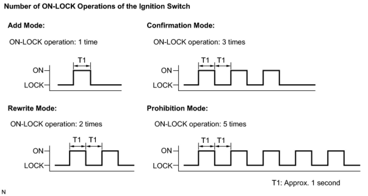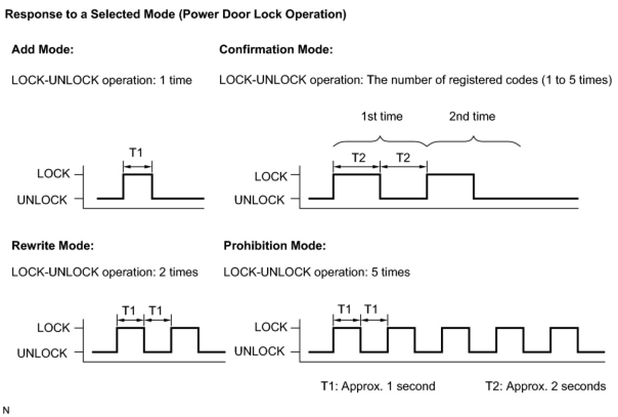 HINT: If the number of on ON-LOCK operations of the ignition switch is 0, 4 or 6 or more, there will be no response (power door lock and unlock operation) to show which mode has been selected.