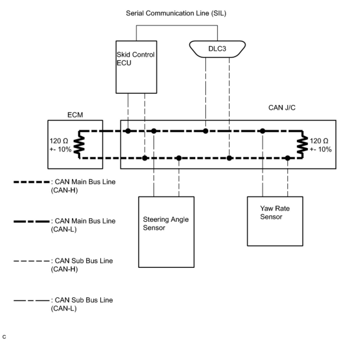(1) Sub bus line is a wire harness which diverges from the main bus line, which is the main bus of the CAN bus, to an ECU or sensor.