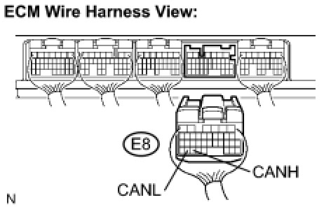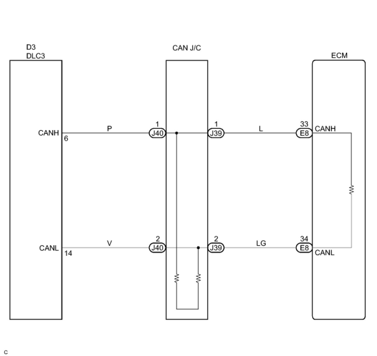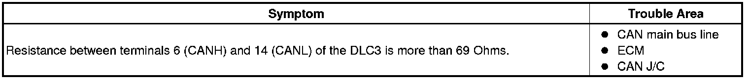 The CAN main bus line and DLC3 sub bus line may have a disconnection when the resistance between terminals 6 (CANH) and 14 (CANL) of the DLC3 is more than 69 Ohms.