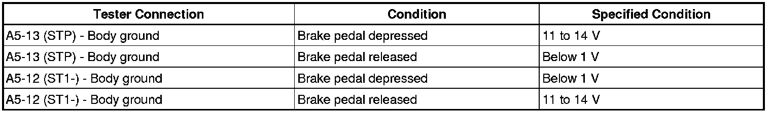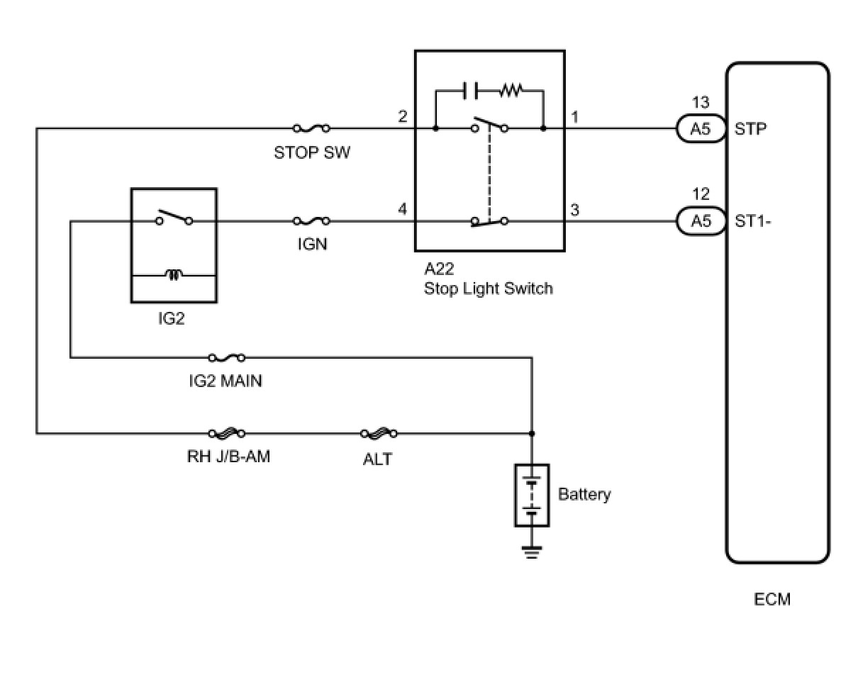 When the brake pedal is depressed, the stop light switch sends a signal to the ECM. When the ECM receives this signal, it cancels the cruise control. The fail-safe function operates to enable normal driving even if there is a malfunction in the stop light signal circuit. The cancellation condition occurs when voltage is applied to terminal STP. When the brake is applied, voltage is normally applied to terminal STP of the ECM through the STOP SW fuse and the stop light switch, and the ECM turns the cruise control off.