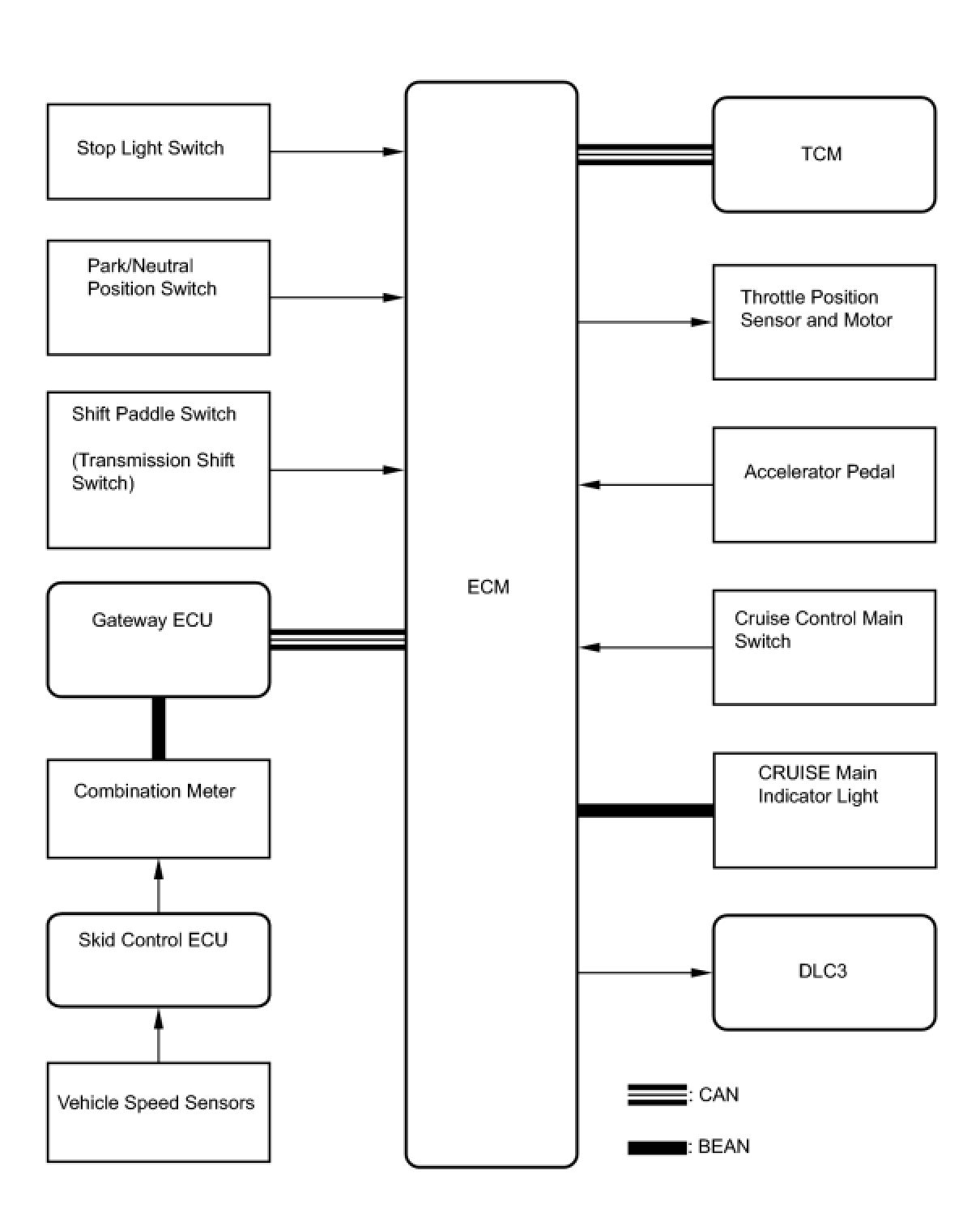- The ECM receives signals such as ON-OFF, - (COAST)/SET, + (ACCEL)/RES (RESUME), and CANCEL from the cruise control main switch and executes the command.