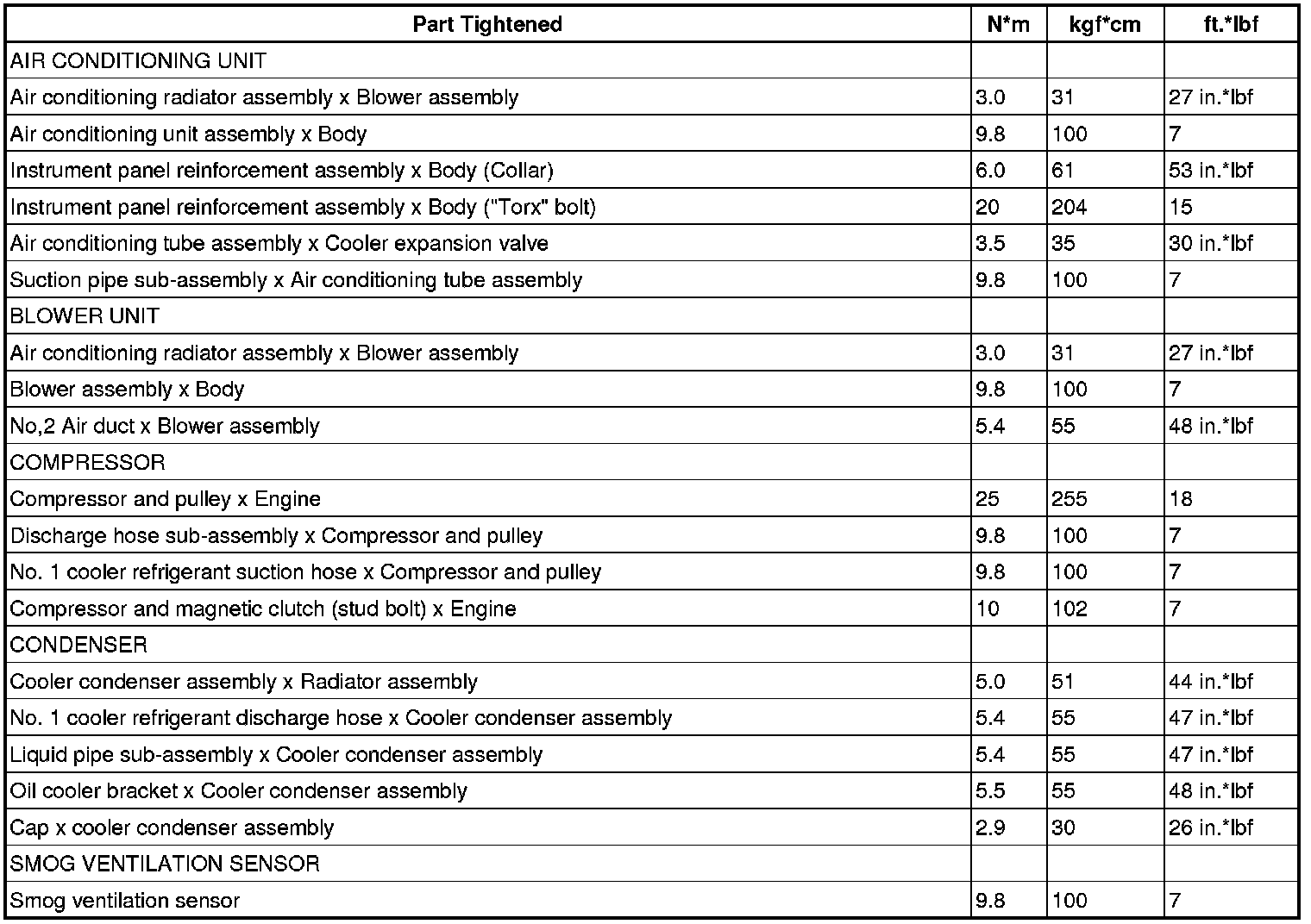 SPECIFICATIONS: HEATING / AIR CONDITIONING: TORQUE SPECIFICATIONS