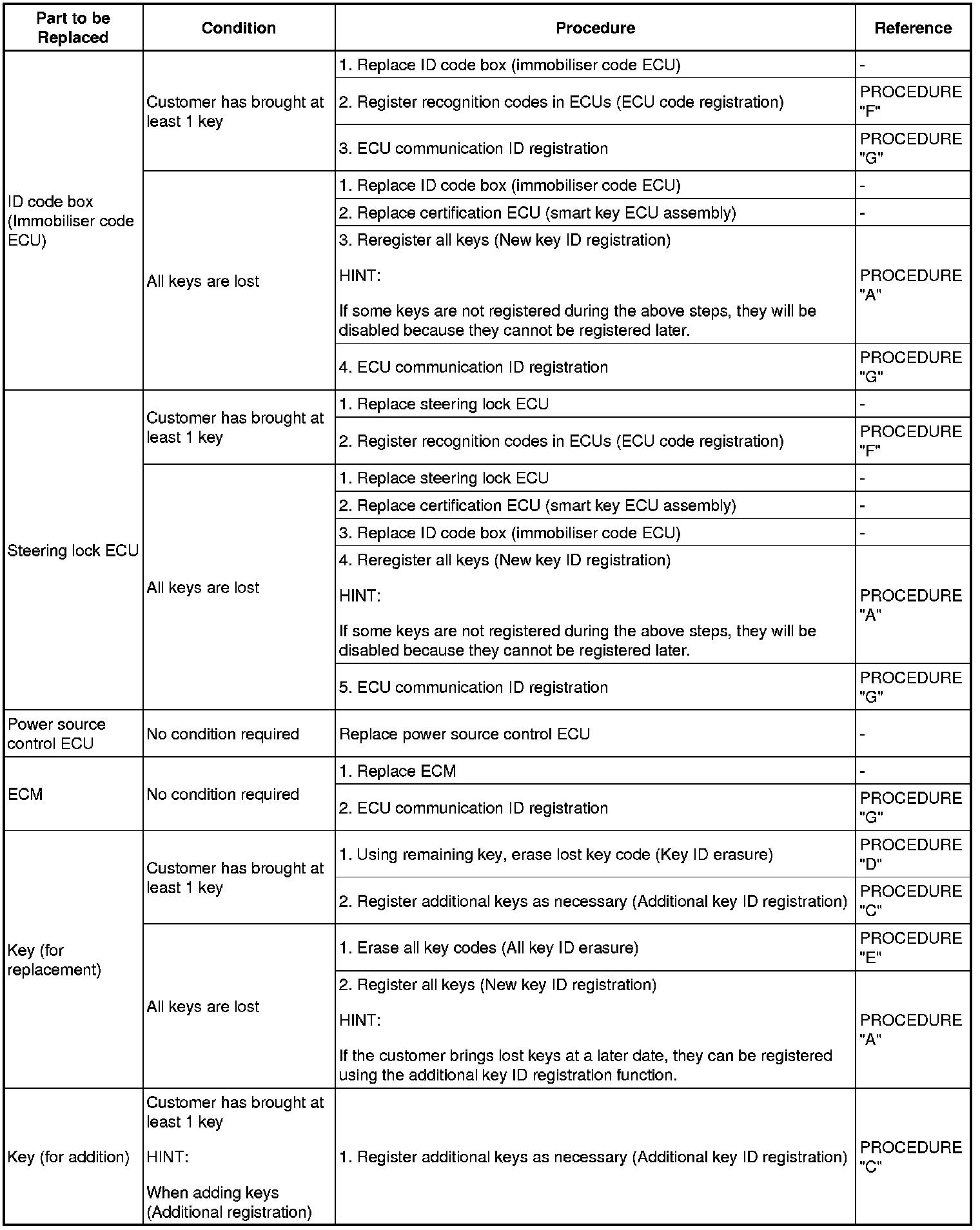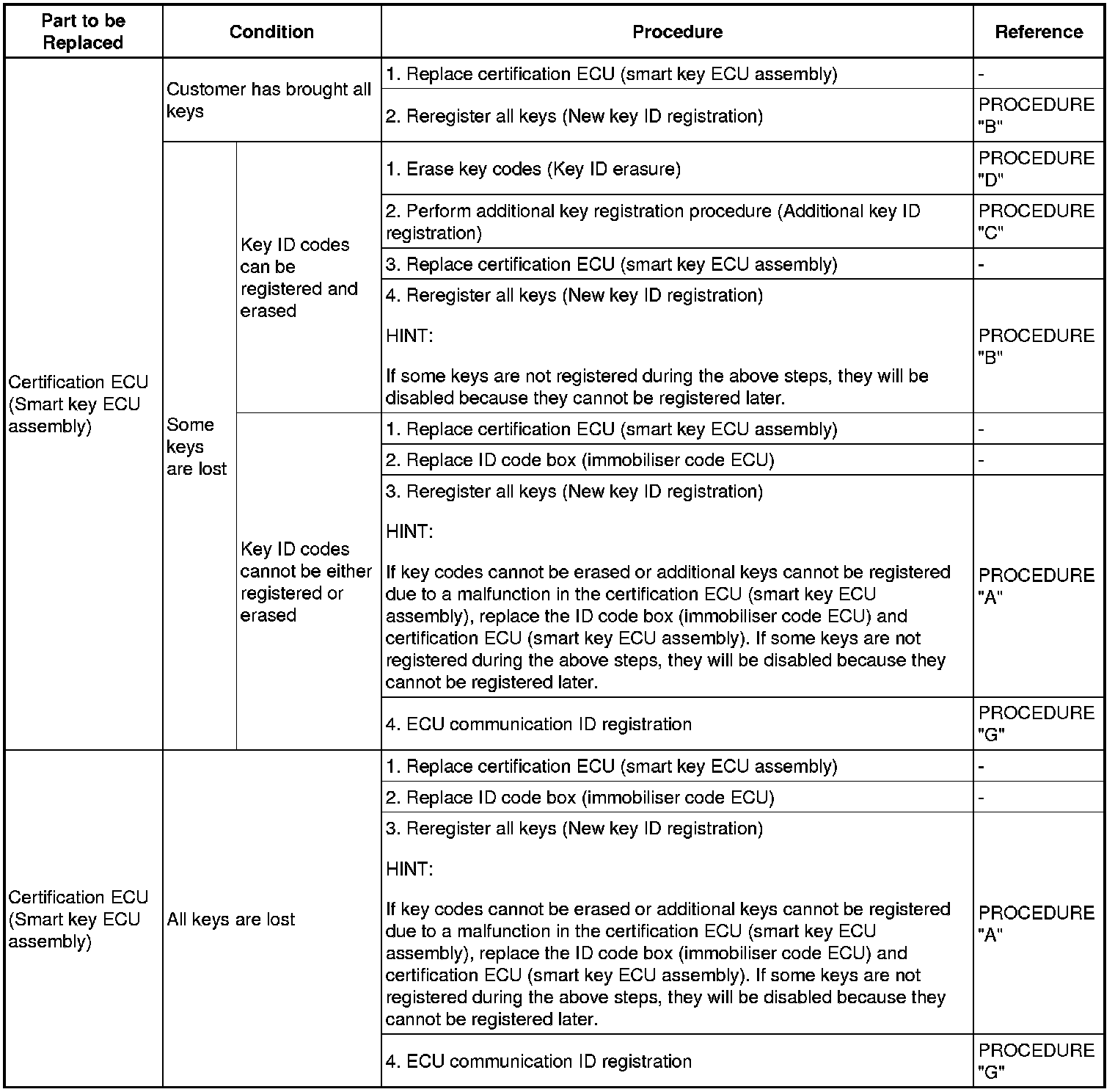(a) The following table shows ECU replacement and key registration procedures for cases in which a malfunctioning ECU has been identified through the troubleshooting of the smart access system with push button start.