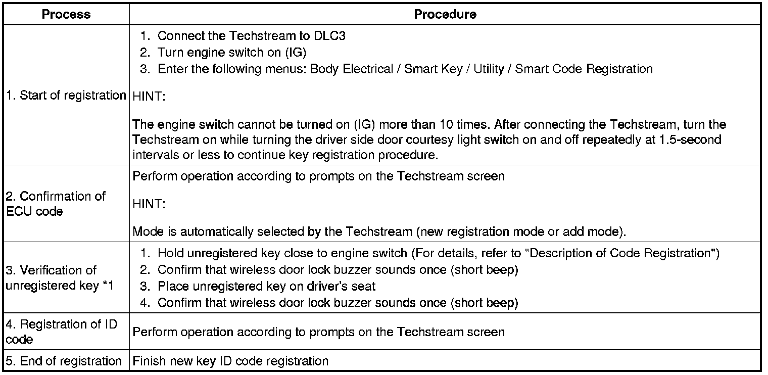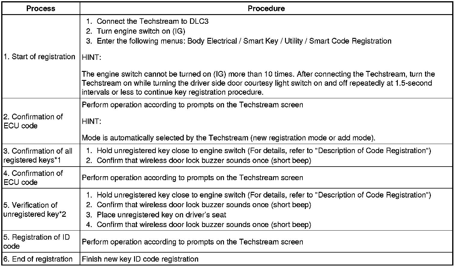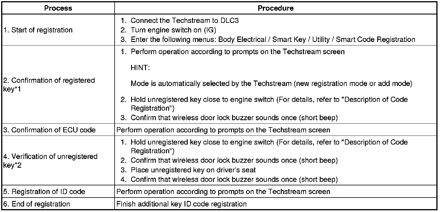 *1: Perform this process for one of the keys registered for the vehicle. Finish the procedure within 30 seconds. If the procedure has not been finished within the specified time, perform the registration procedures again from process 1.