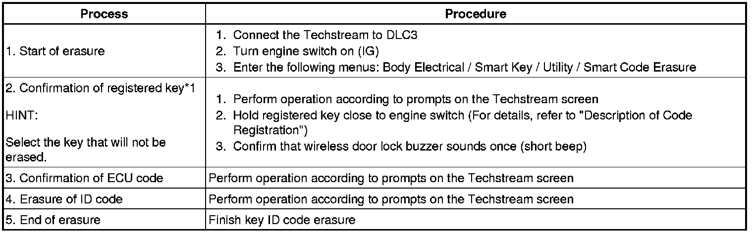 *1: Perform this process for one of the keys registered for the vehicle. Finish the procedure within 30 seconds. If the procedure has not been finished within the specified time, perform the erasure procedures again from process 1.