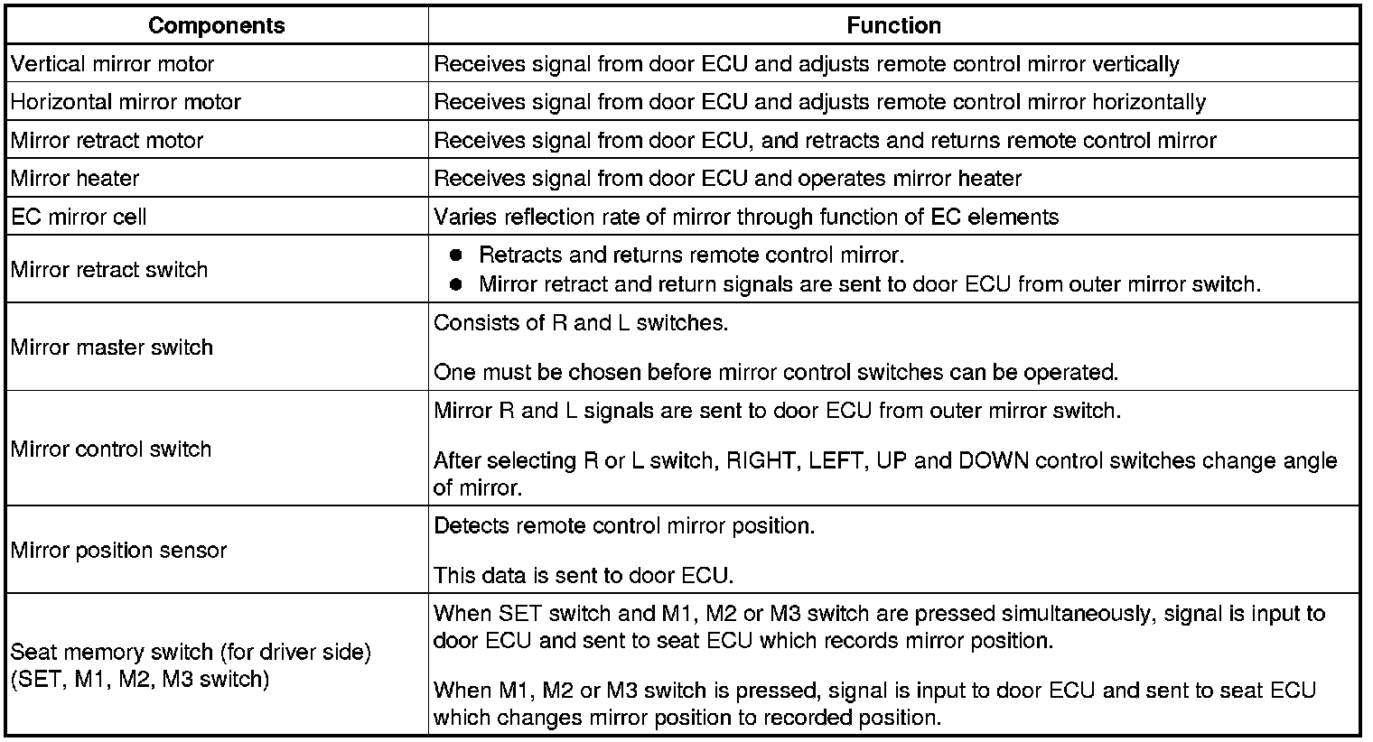 (a) This system has the following functions: automatic glare-resistant electrochromic (EC) mirror, reverse shift-linked mirror, electrical remote control type mirror, memory function, and rear window defogger-linked mirror heater.