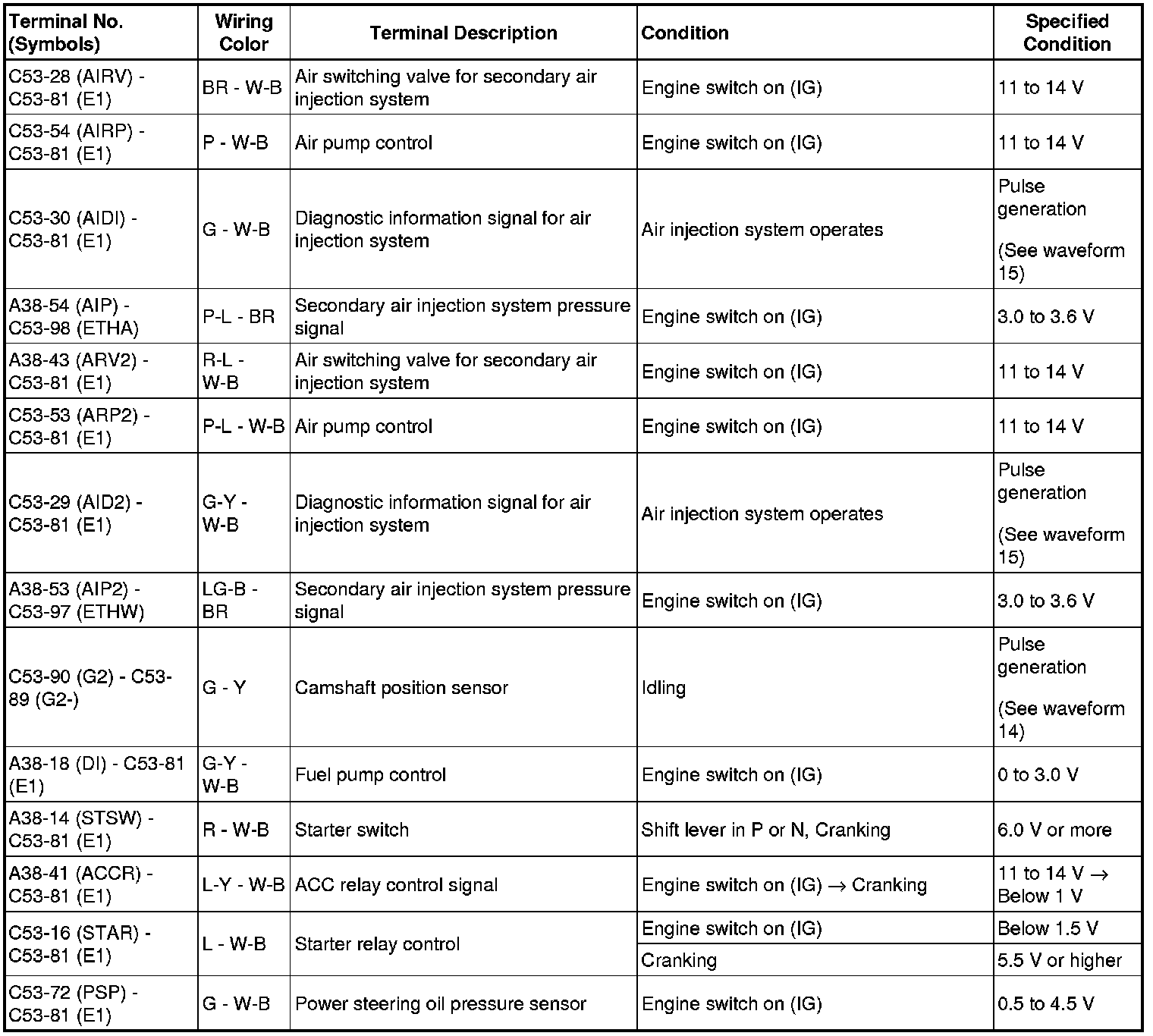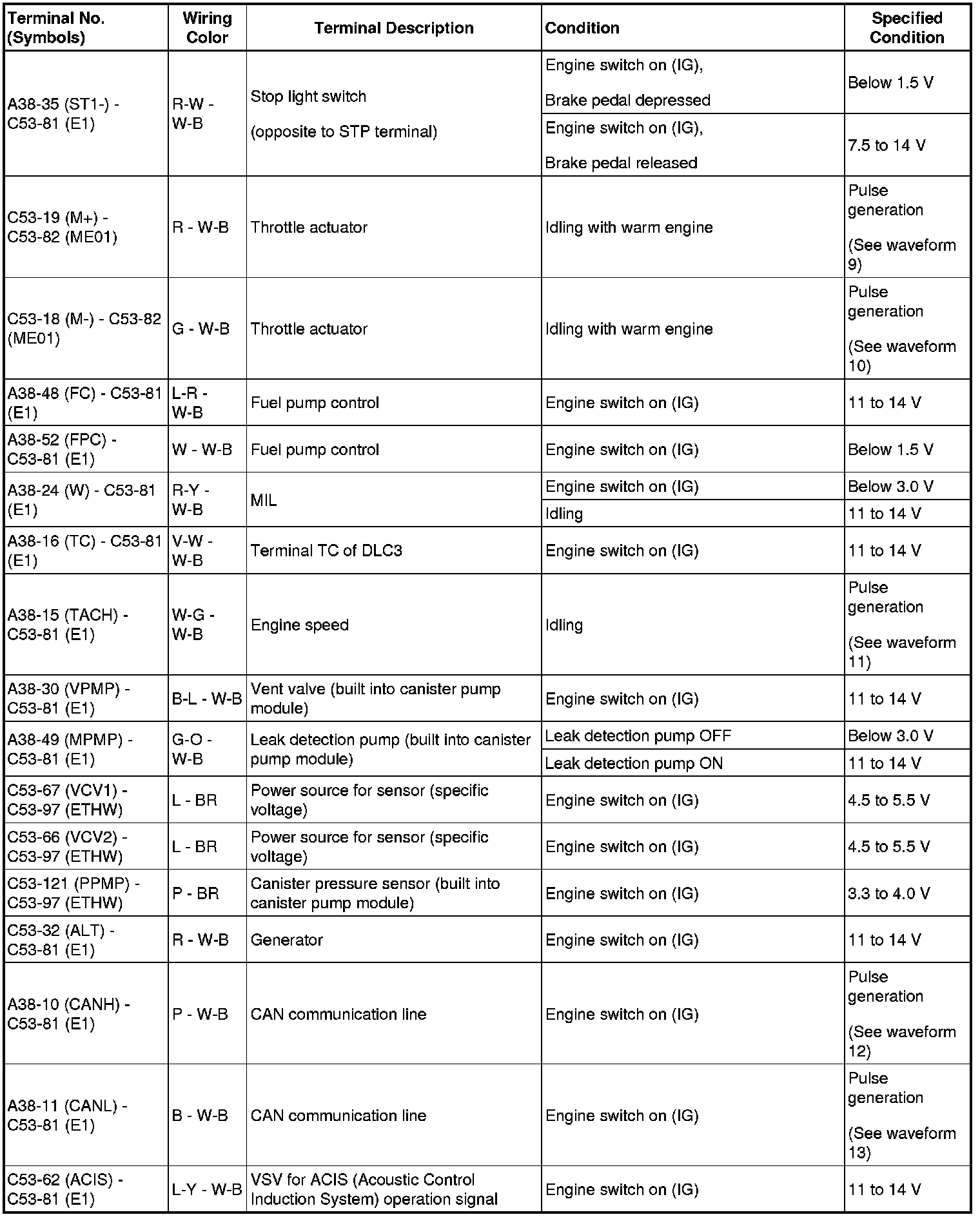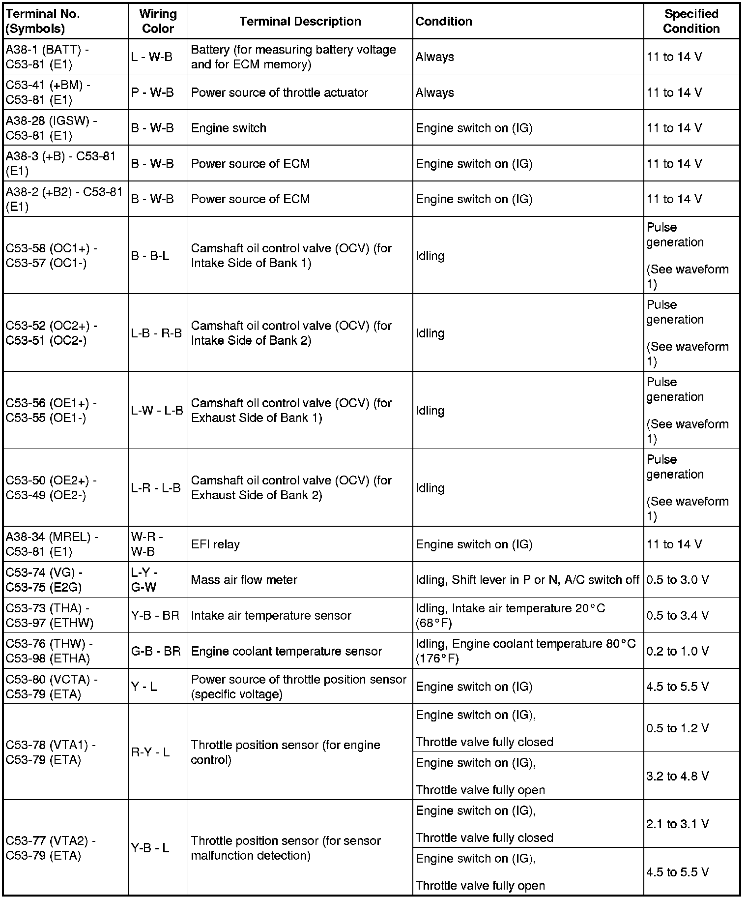 The standard normal voltage between each pair of ECM terminals is shown in the table below. The appropriate conditions for checking each pair of terminals are also indicated. The result of checks should be compared with the standard normal voltage for that pair of terminals, displayed in the Specified Condition column. The illustration above can be used as a reference to identify the ECM terminal locations.