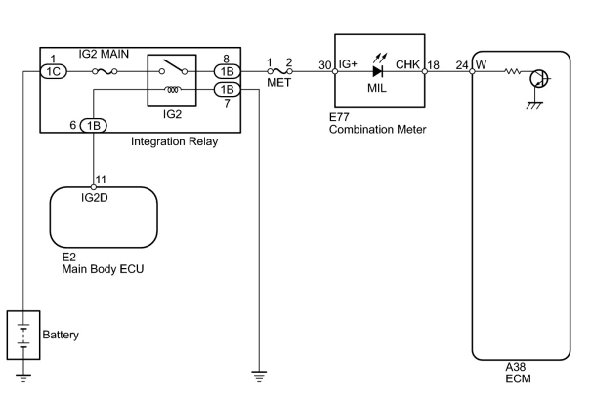 The MIL (Malfunction Indicator Lamp) is used to indicate vehicle malfunction detections by the ECM. When the engine switch is turned on (IG), power is supplied to the MIL circuit, and the ECM provides the circuit ground which illuminates the MIL.