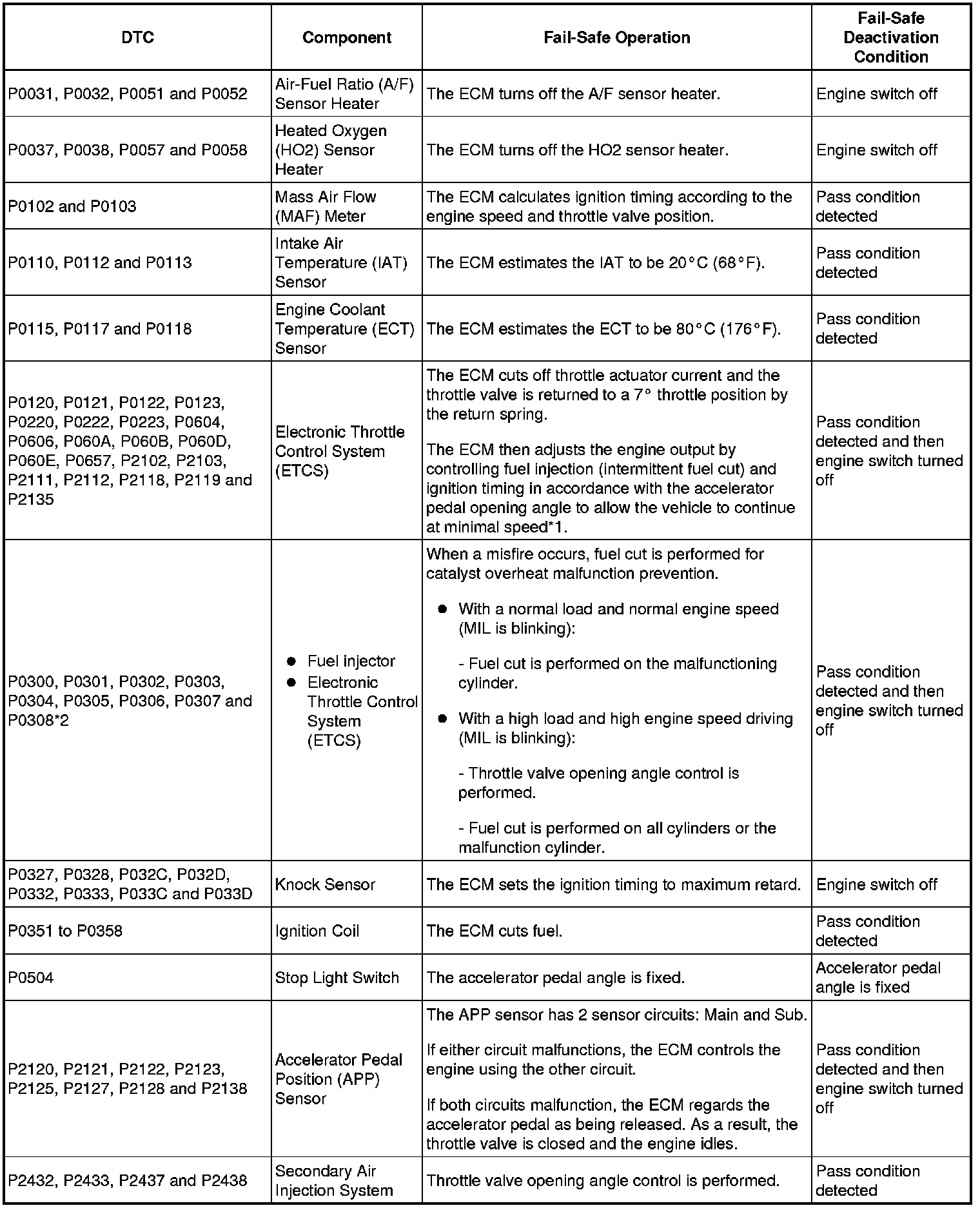 If any of the following DTCs are stored, the ECM enters fail-safe mode to allow the vehicle to be driven temporarily.