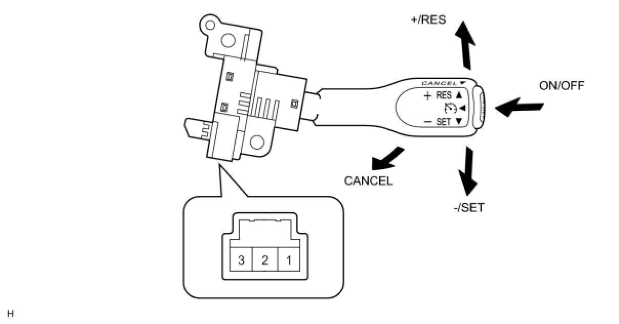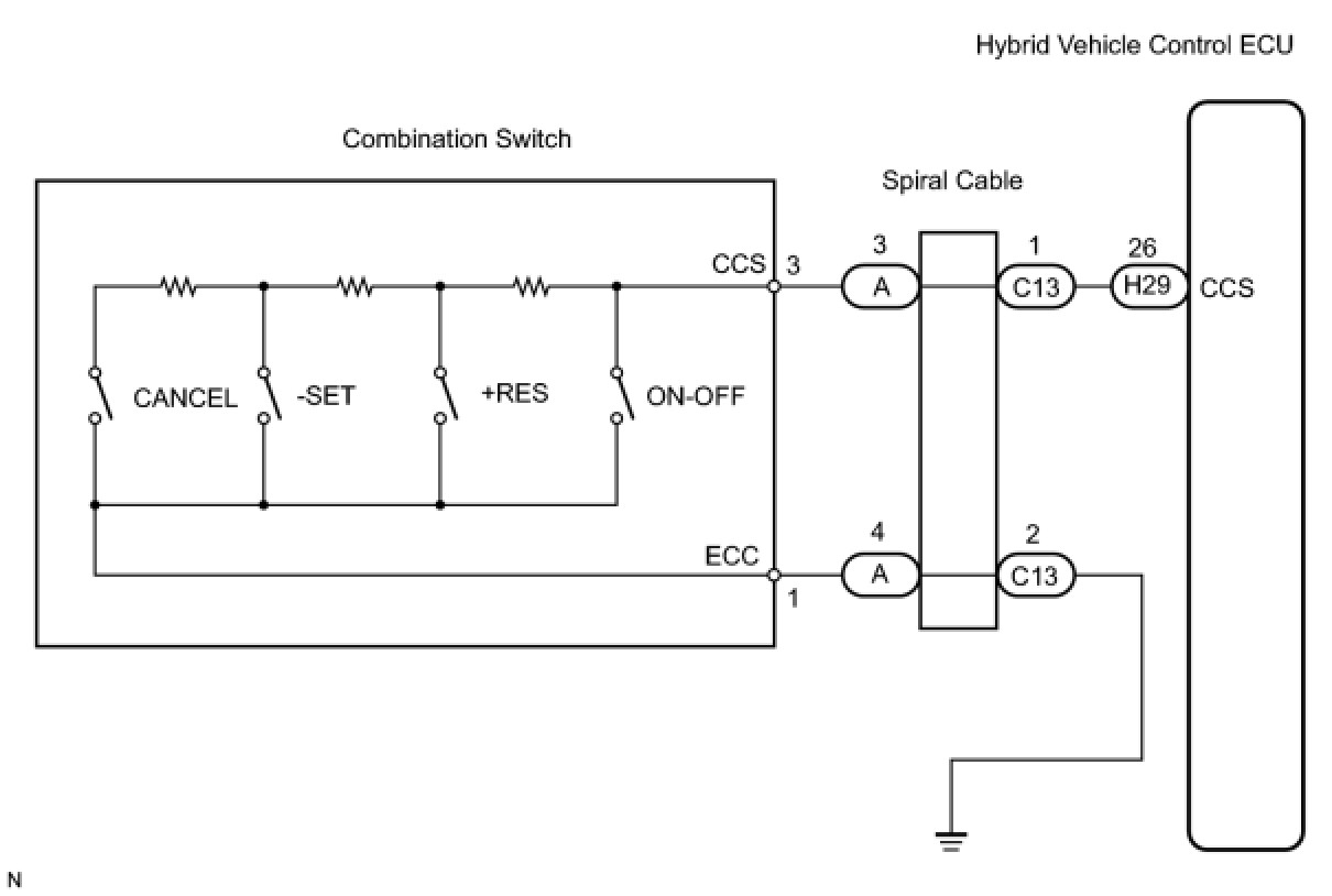 The cruise control main switch operates 7 functions: SET, COAST, TAP-DOWN, RESUME, ACCEL, TAP-UP, and CANCEL. The SET, TAP-DOWN and COAST functions, and the RESUME, TAP-UP and ACCEL functions are operated with the same switch. The cruise control main switch is an automatic return type switch which turns on only while operating it in each arrow direction and turns off after releasing it. The internal contact point of the cruise control main switch is turned on with the switch operation. Then the hybrid vehicle control ECU reads the resistance value that has been changed by the switch operation to control SET, COAST, RESUME, ACCEL and CANCEL.