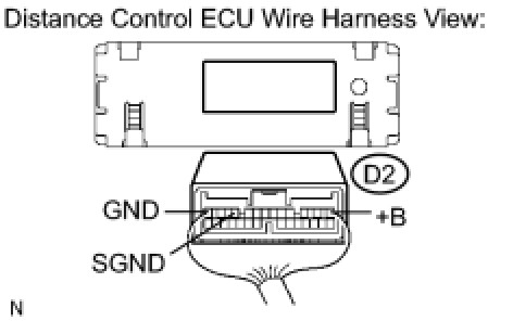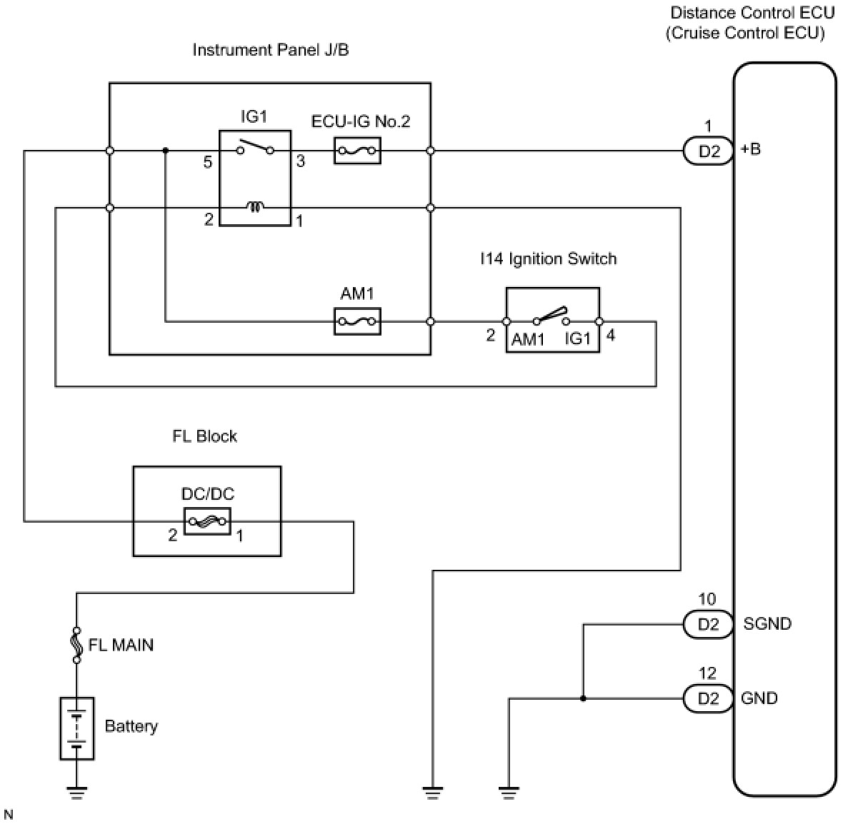 This circuit provides power to operate the distance control ECU (cruise control ECU). The distance control ECU determines information about the vehicle in front based on data from the laser sensor, and then decides how much acceleration and/or deceleration is needed to maintain the set distance. The distance control ECU also requests the skid control ECU to apply braking and sound the buzzer.