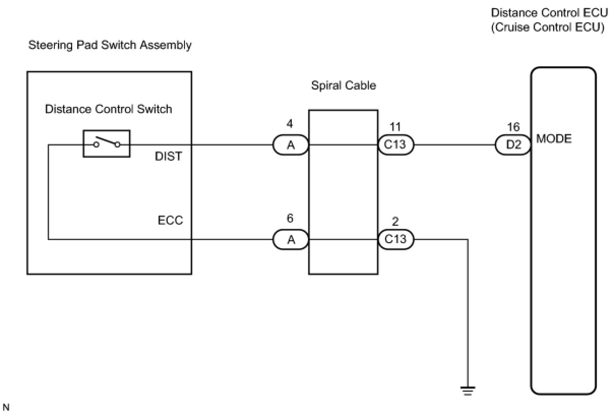 The distance control switch sets the vehicle-to-vehicle distance mode. The distance control switch is installed in the steering pad switch. The vehicle-to-vehicle distance set value can be changed by operating the steering pad switch (distance control switch) while the dynamic laser cruise control system is in operation. The steering pad switch uses the BEAN to communicate with each ECU. Therefore, it does not have a direct connection with the hybrid vehicle control ECU. If there are any malfunction in the communications line of the steering pad switch, one or more DTCs in the multiplex communication system are output.