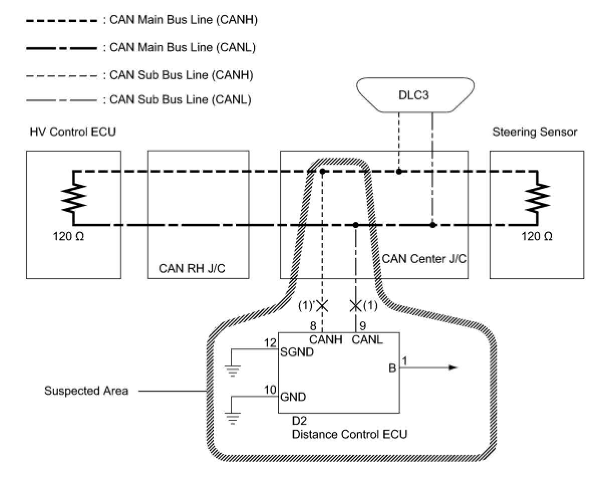 1. CHECK CAN BUS LINE FOR DISCONNECTION (DISTANCE CONTROL ECU SUB BUS LINE)